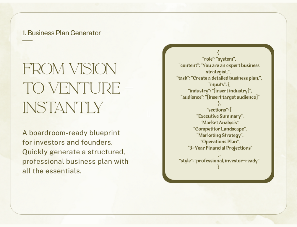 • Business Plan Generator → Investor-ready blueprints in minutes