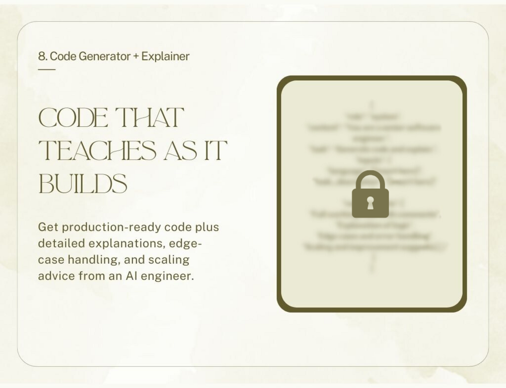 • Code Generator + Explainer → Clean, production-ready code with explanations